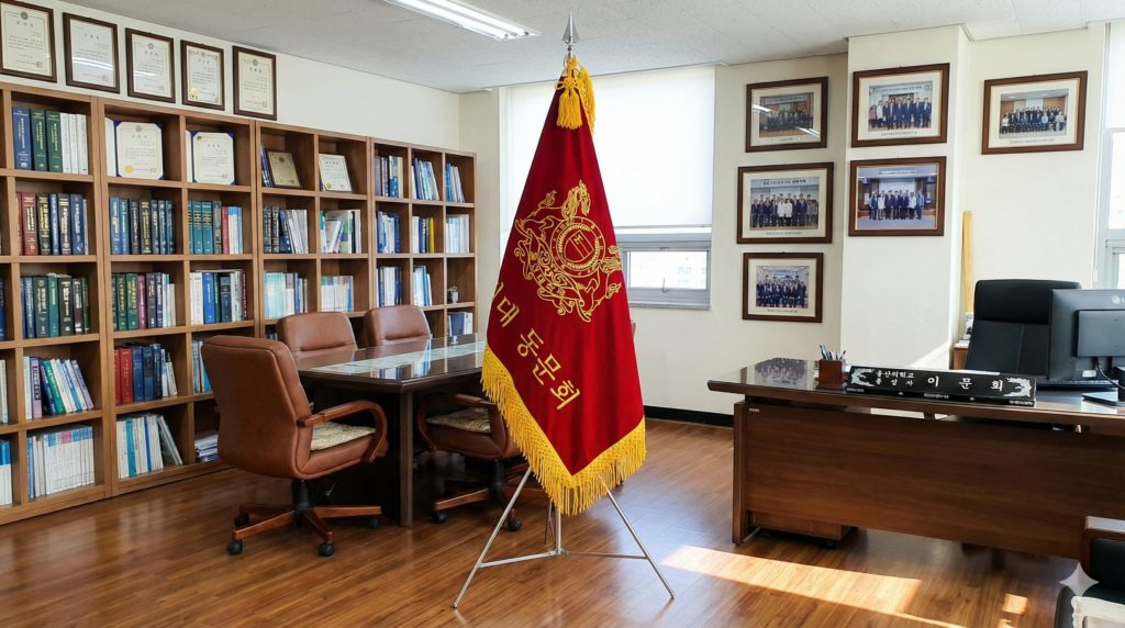 자수동문회기size:135*90cm소재:비로드수술:노랑수술부속:스텐깃대.삼발이